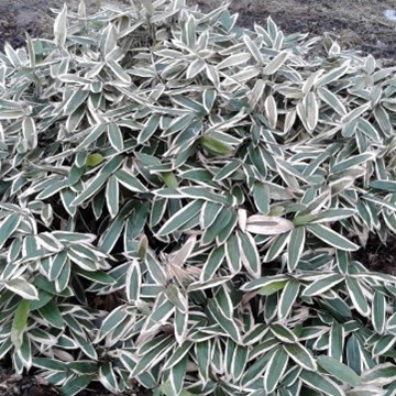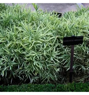 Bardzo efektowna, rzadko spotykana odmiana pochodząca z Japonii, o nietypowych, bo kremowo paskowanych liściach, dorastająca do 100-150 cm wysokości. to odmiana zimozielona. Plejoblast może być z powodzeniem uprawiany w dużych pojemnikach. Preferuje miejsca półcieniste i osłonięte od wiatru. Cechuje się dobrą mrozoodpornością – do – 20’C, wskazane jest jednak zastosowanie dodatkowego ściółkowania jesienią w obrębie systemu korzeniowego, gdyż może podmarznąć w bezśnieżne zimy.