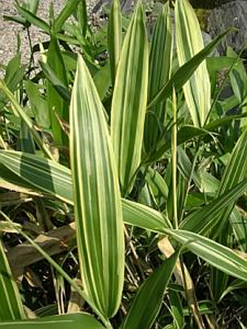 To kolejny bambus pochodzący z Japonii. Odmiana ‘Albostriata’ słynie z bardzo dekoracyjnego ulistnienia. Liście są duże (15×4 cm), zielone z wyjątkowo atrakcyjnym kremowo-białym paskowaniem w sezonie letnim. Niektóre z nich są niemal całkiem białe. W późniejszych miesiącach jasne paskowanie jest obserwowane tylko na nielicznych liściach. Gatunek ten cechuje się mniejszą mrozoodpornością, przez co w naszym klimacie nie dorasta do dużych rozmiarów. Stosunkowo niewielki wzrost ułatwia zabezpieczenie rośliny na zimę. Jest szczególnie przydatny jako gatunek okrywowy, do nasadzeń grupowych, a także do kompozycji ogrodowych. Osiąga wysokość : 50-100 cm.