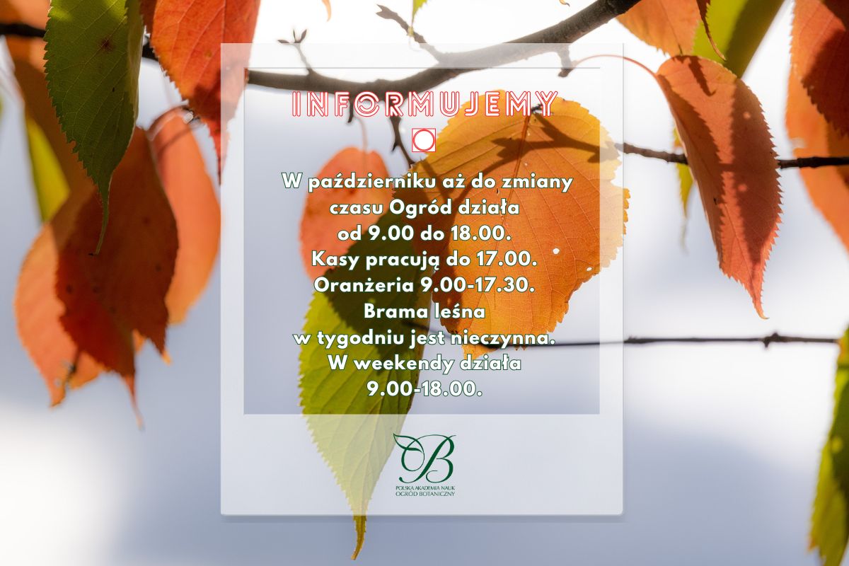 In October, until the change to winter time, the Garden operates from 9 a.m. to 6 p.m. Box offices work until 5 p.m.